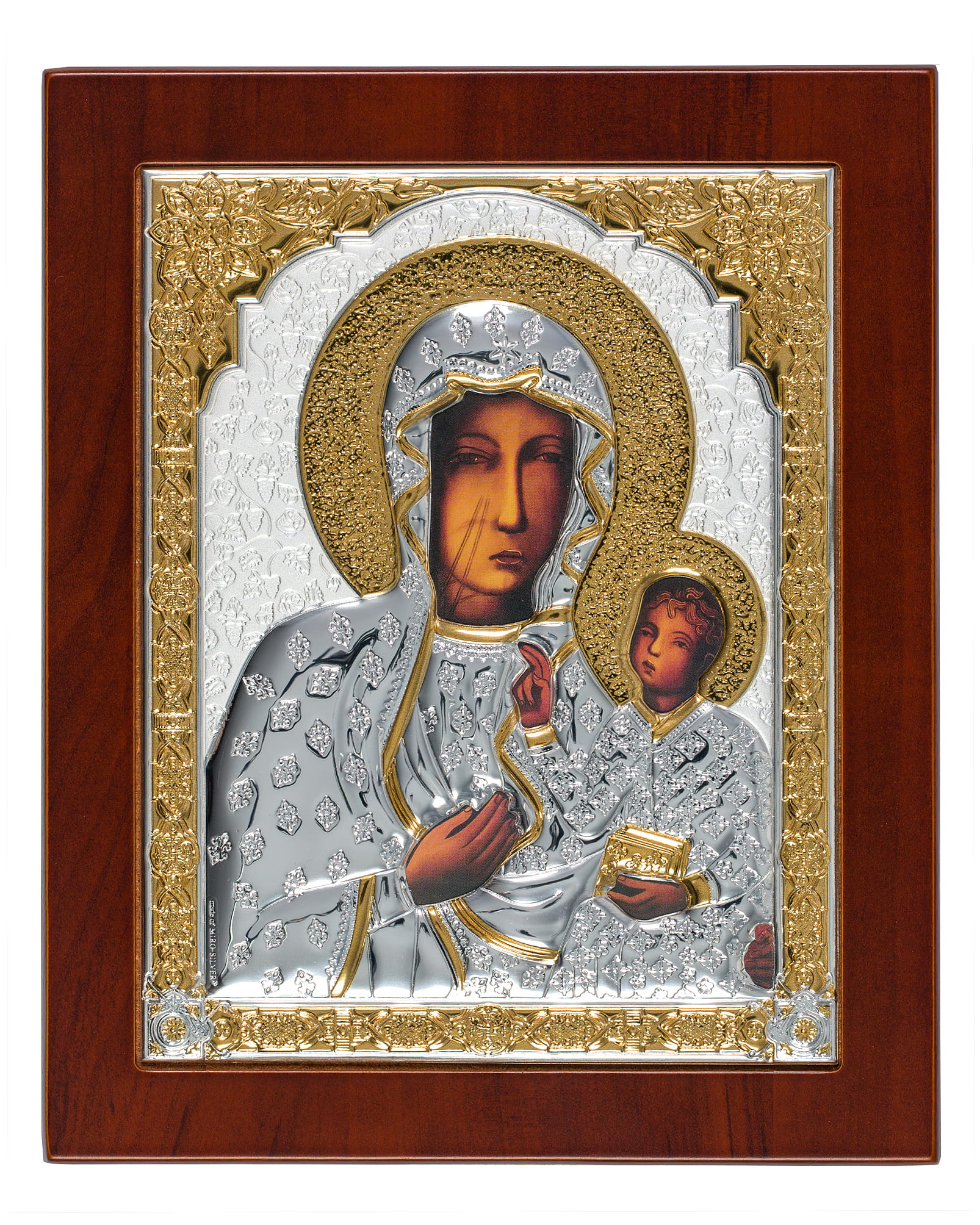 Ikona wykonana na brązowej drewnianej desce z wgłębieniem tzw. kowczegiem do powieszenia i postawienia. Koszulka ikony zawiera warstwę czystego srebra o próbie 999,95 dodatkowo ma częściowe złocenie 24k złotem. Pod koszulką znajduje się cały wizerunek obraz ikony. Każda ikona jest zapakowana w eleganckie pudełko.