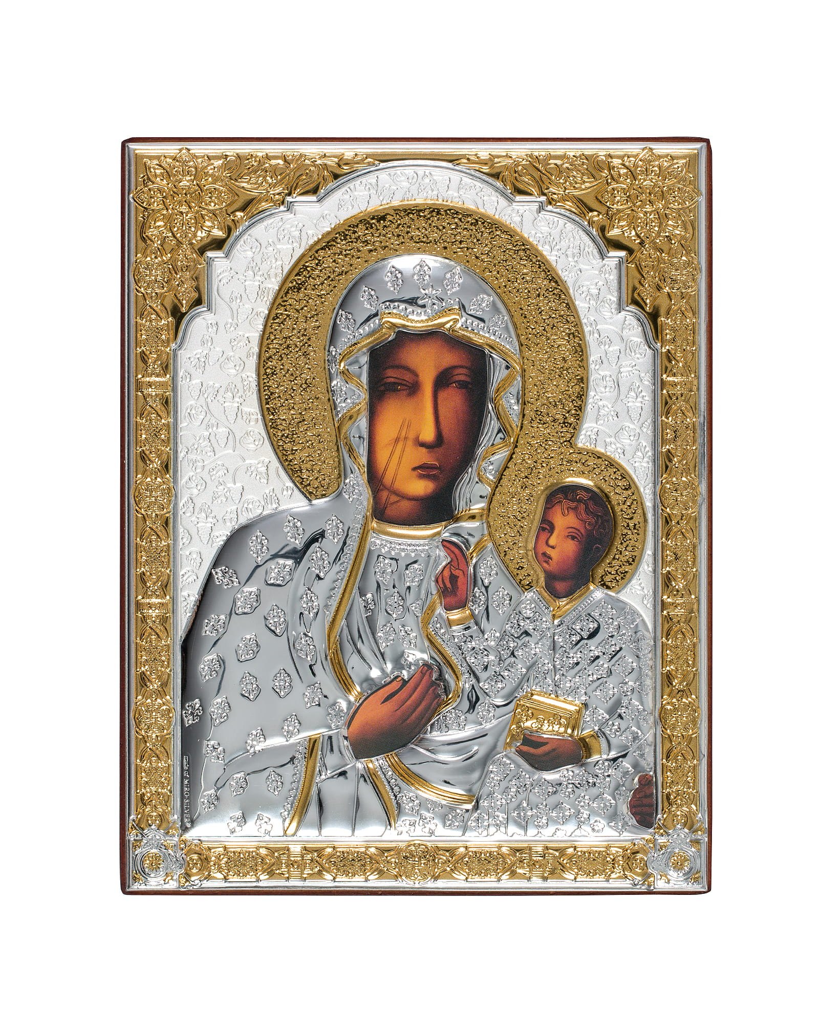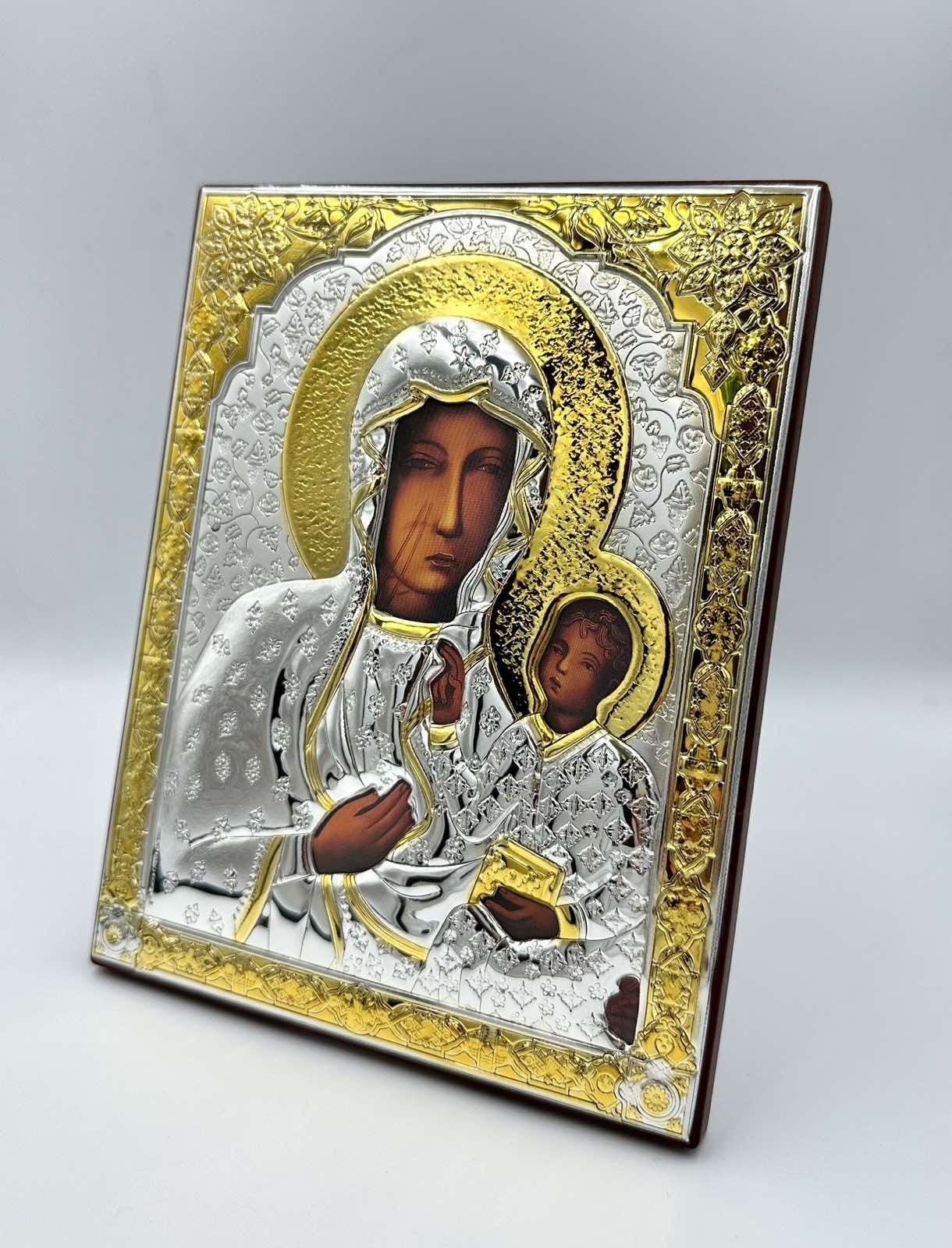 Ikona wykonana na brązowej drewnianej desce do powieszenia i postawienia. Koszulka ikony zawiera warstwę czystego srebra o próbie 999,95 dodatkowo ma częściowe złocenie 24k złotem. Pod koszulką znajduje się cały wizerunek obraz ikony. Każda ikona jest zapakowana w eleganckie pudełko.