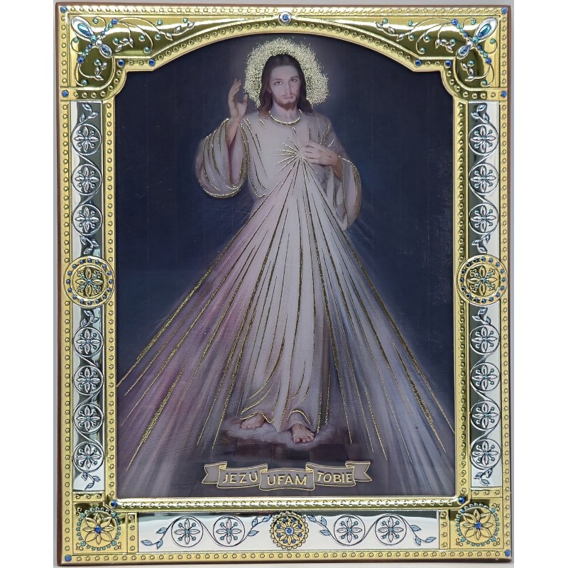 Ikona została wykonana na brązowej drewnianej desce za szkłem w posrebrzanej ramce ze złoceniami 24k złotem. Ikona jest zapakowana w eleganckie pudełko.