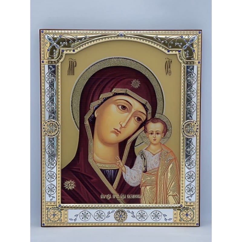 Ikona została wykonana na brązowej drewnianej desce za szkłem w posrebrzanej ramce ze złoceniami 24k złotem. Ikona jest zapakowana w eleganckie pudełko.