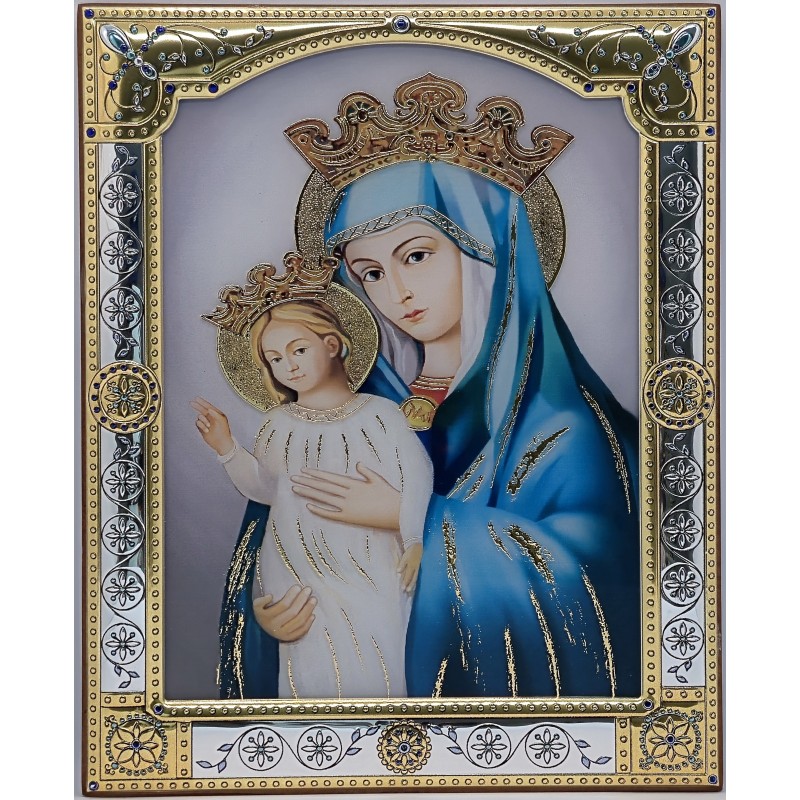 Ikona została wykonana na brązowej drewnianej desce za szkłem w posrebrzanej ramce ze złoceniami 24k złotem. Ikona jest zapakowana w eleganckie pudełko.