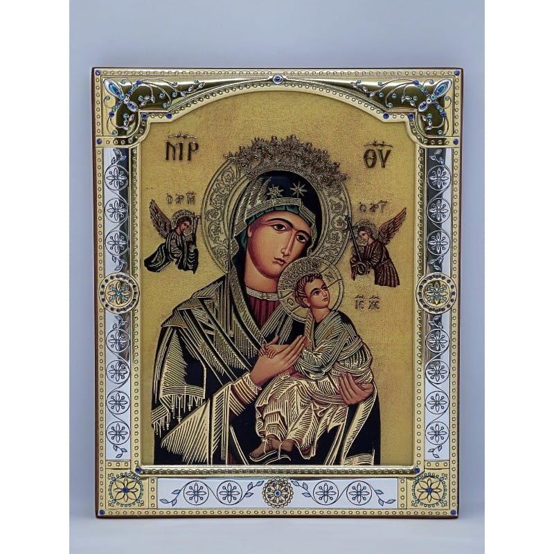 Ikona została wykonana na brązowej drewnianej desce za szkłem w posrebrzanej ramce ze złoceniami 24k złotem. Ikona jest zapakowana w eleganckie pudełko.