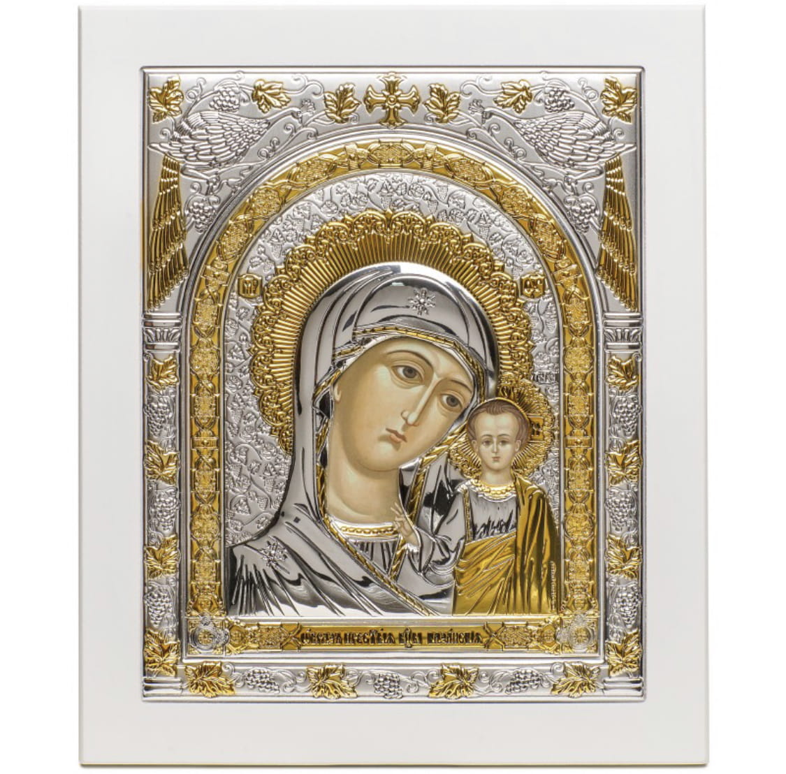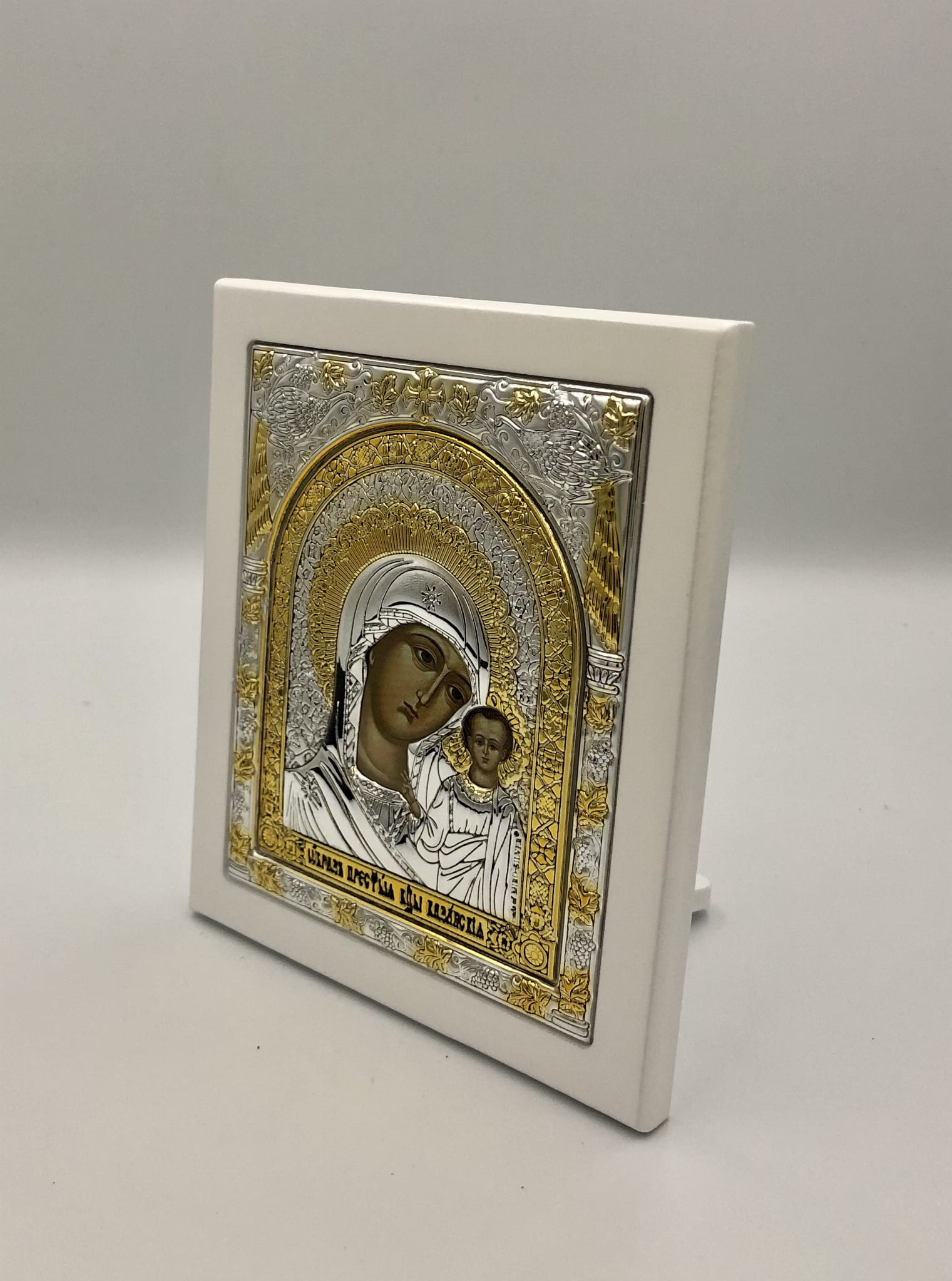 Ikona wykonana na białej drewnianej desce. Koszulka ikony zawiera warstwę czystego srebra o próbie 999,95 dodatkowo ma częściowe złocenie 24k złotem. Pod koszulką znajduje się cały wizerunek obraz ikony. Każda ikona jest zapakowana w eleganckie pudełko.