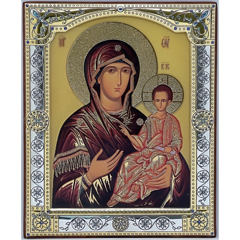 Ikona została wykonana na brązowej drewnianej desce za szkłem w posrebrzanej ramce ze złoceniami 24k złotem. Ikona jest zapakowana w eleganckie pudełko.