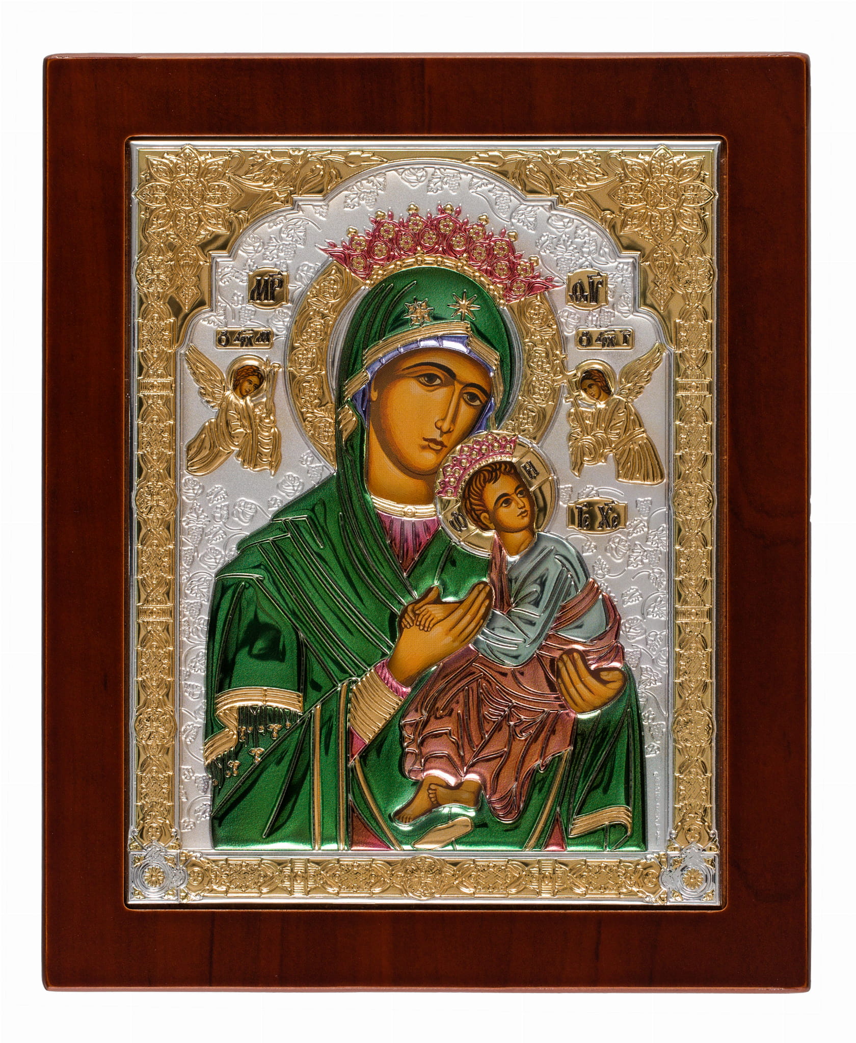 Ikona wykonana na brązowej drewnianej desce z wgłębieniem tzw. kowczegiem do powieszenia i postawienia. Koszulka ikony zawiera warstwę czystego srebra o próbie 999,95 dodatkowo ma częściowe złocenie 24k złotem oraz emalia. Pod koszulką znajduje się cały wizerunek obraz ikony. Każda ikona jest zapakowana w eleganckie pudełko.