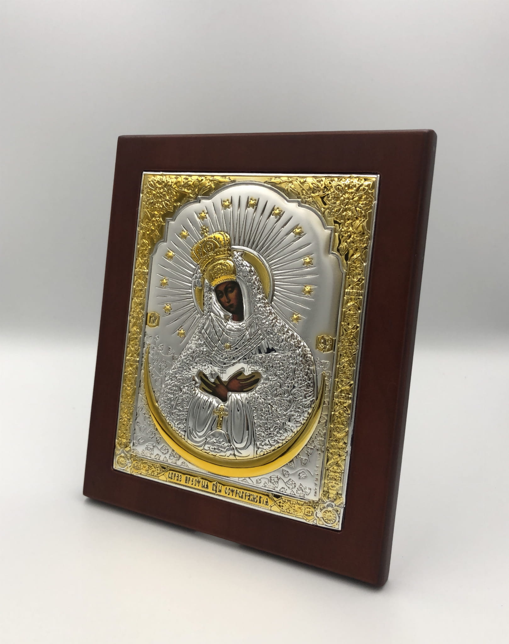 Ikona wykonana na brązowej drewnianej desce z wgłębieniem tzw. kowczegiem . Koszulka ikony zawiera warstwę czystego srebra o próbie 999,95 dodatkowo ma częściowe złocenie 24k złotem. Pod koszulką znajduje się cały wizerunek obraz ikony. Każda ikona jest zapakowana w eleganckie pudełko.