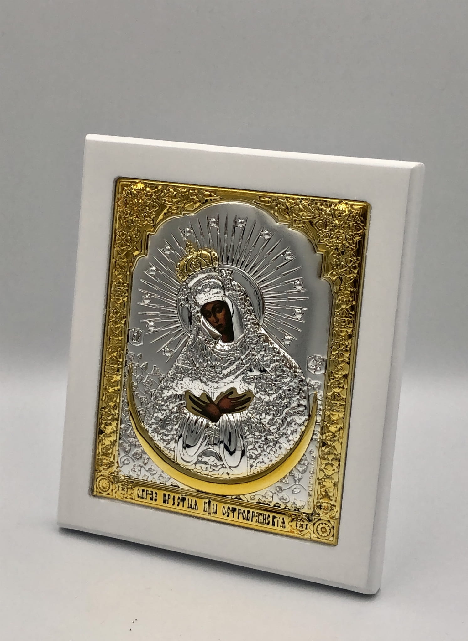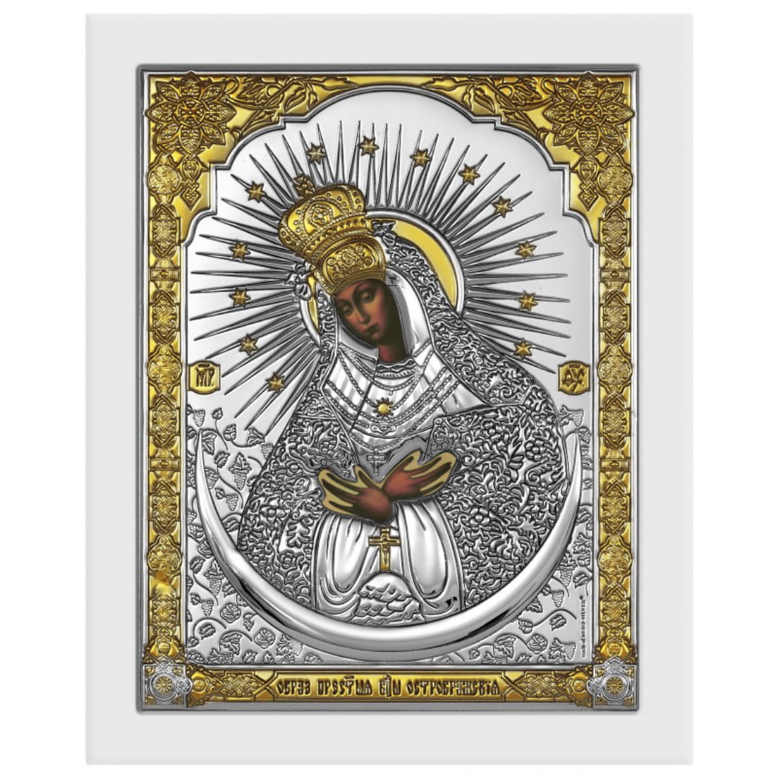 Ikona wykonana na białej drewnianej desce z wgłębieniem tzw. kowczegiem. Koszulka ikony zawiera warstwę czystego srebra o próbie 999,95 dodatkowo ma częściowe złocenie 24k złotem. Pod koszulką znajduje się cały wizerunek obraz ikony. Każda ikona jest zapakowana w eleganckie pudełko.