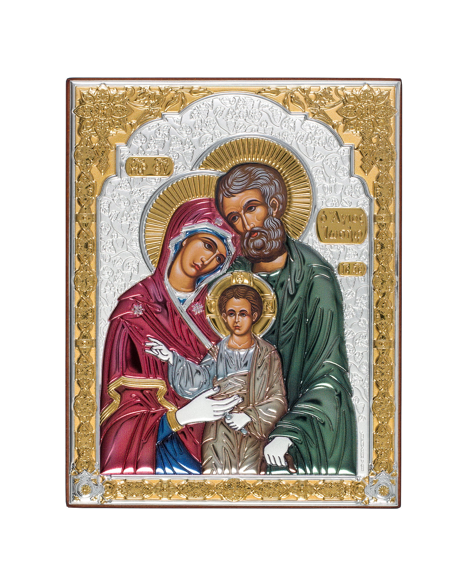 Ikona wykonana na brązowej drewnianej desce do powieszenia i postawienia. Koszulka ikony zawiera warstwę czystego srebra o próbie 999,95 dodatkowo ma częściowe złocenie 24k złotem oraz emalia. Pod koszulką znajduje się cały wizerunek obraz ikony. Każda ikona jest zapakowana w eleganckie pudełko.