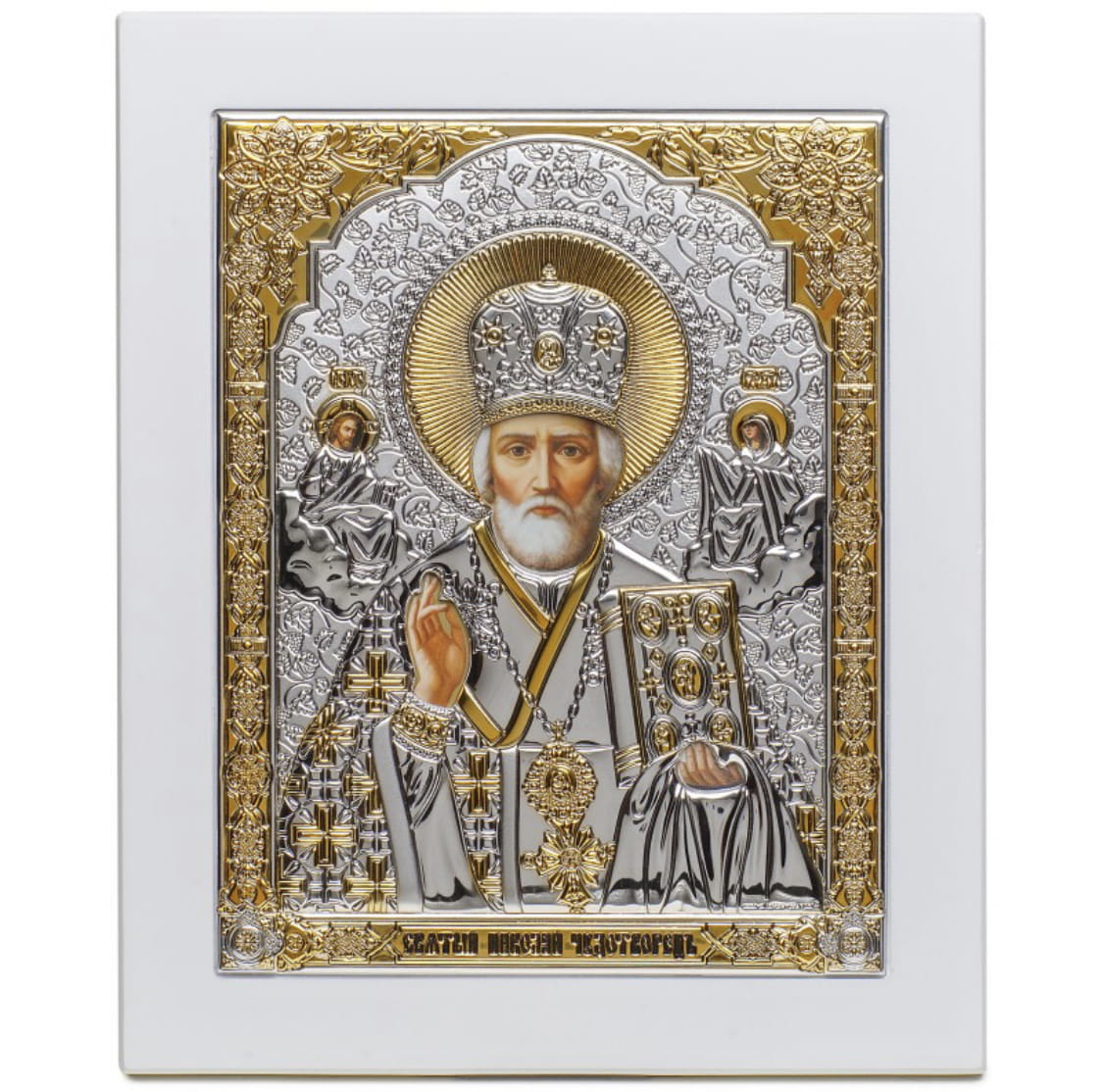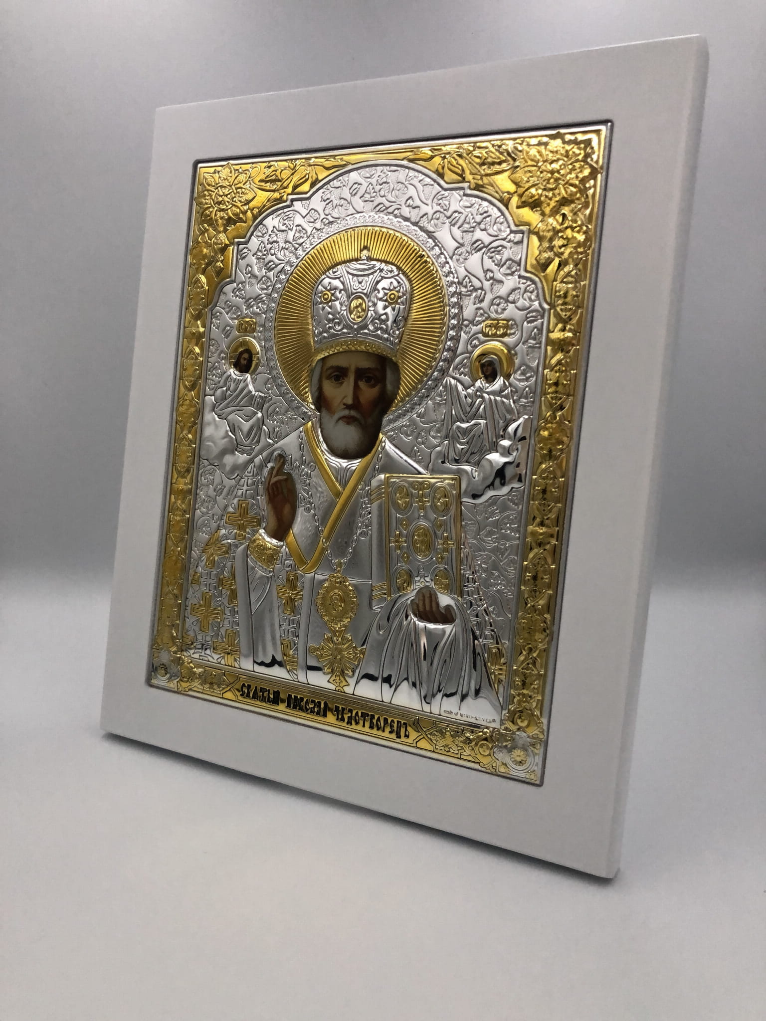 Ikona wykonana na białej drewnianej desce z wgłębieniem tzw. kowczegiem. Koszulka ikony zawiera warstwę czystego srebra o próbie 999,95 dodatkowo ma częściowe złocenie 24k złotem. Pod koszulką znajduje się cały wizerunek obraz ikony. Każda ikona jest zapakowana w eleganckie pudełko.