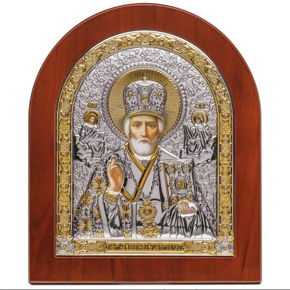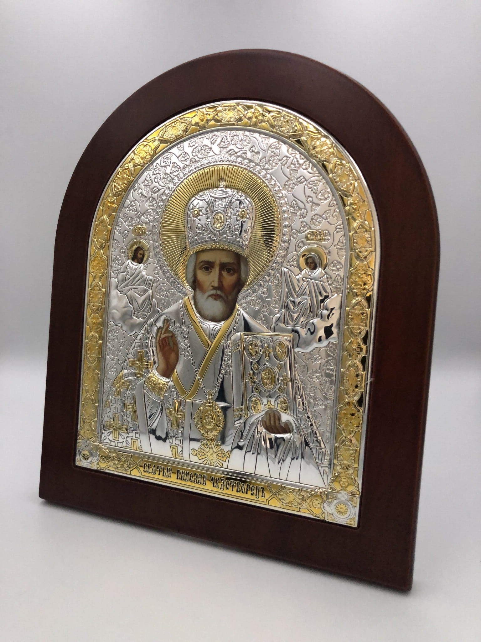 Ikona wykonana na brązowej drewnianej desce z wgłębieniem tzw. kowczegiem. Koszulka ikony zawiera warstwę czystego srebra o próbie 999,95 dodatkowo ma częściowe złocenie 24k złotem. Pod koszulką znajduje się cały wizerunek obraz ikony. Każda ikona jest zapakowana w eleganckie pudełko.